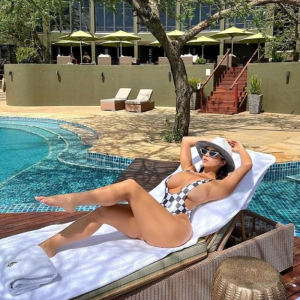 Demi Rose struggles to contain her cleavage in a VERY daring swimsuit as she sunbathes during her trip to Africa