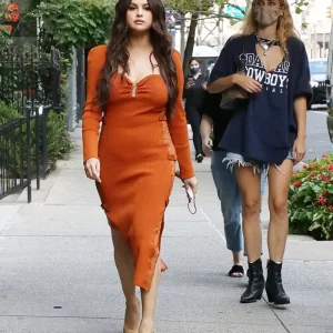 Selena Gomez is showstopping in an orange dress with sheer lace sides as she hits the town in NYC