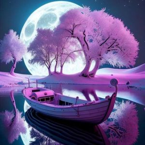 In the golden hour’s embrace, a picturesque scenery unfolds along the riverbanks, immersed in the ethereal hues of a captivating purple sunset