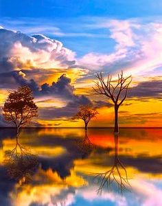 In the embrace of night, a symphony of natural beauty unfolds as the trees cast their graceful silhouettes upon the tranquil waters of a river.