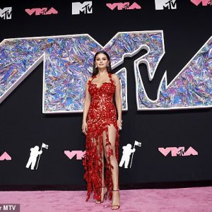 Selena Gomez is red hot in a low-cut floral gown with a sizzling thigh-high slit as she attends the MTV Video Music Awards 2023