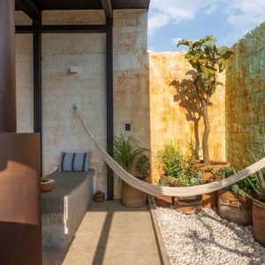 While walking this concrete corridor, the lush vegetation and clay planters create a micro-climate that embraces the user into a cozy desert-like environment. Further down the corridor, the second space…