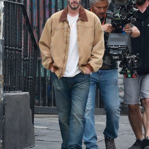 Keanu Reeves looks focused as he films scenes for director Jonah Hill’s dark comedy Outcome in downtown Los Angeles